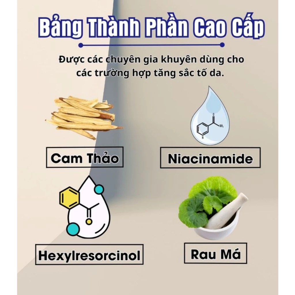– Đẩy lùi hắc tố melanin: Thâm nhập vào lớp biểu bì da, ức chế hắc tố melanin.