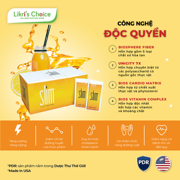 Bios Life Slim với hệ ma trận chất xơ độc quyền giúp giảm hấp thụ tinh bột và các chất béo xấu trong bữa ăn, từ đó ổn định và cân bằng lượng đường huyết sau ăn, hỗ trợ đốt mỡ nội tạng, đặc biệt còn cung cấp hệ chất xơ và khoáng chất cho cơ thể. Bios Life Slim phù hợp cho những người giảm cân, tiểu đường và các chứng bệnh liên quan đến mỡ nội tạng. Sản phẩm nằm trong PDR – Dược thư thế giới.